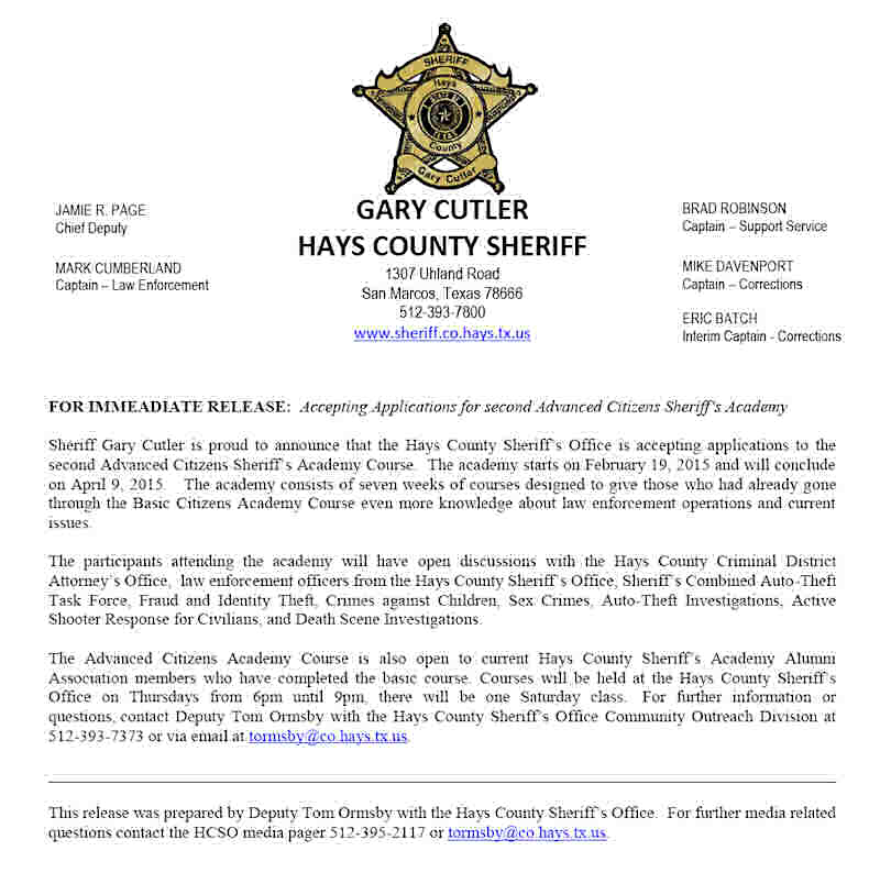 Categories News 2nd Advanced Citizens Sheriff' Academy Announced Post author By SiteAdmin Post date January 19, 2015 Link to course announcement Link to course application ← Volunteer Opportunity: Provide Assistance To Inventory Specialist → Sunshine Kids Volunteer Opportunities (and more)